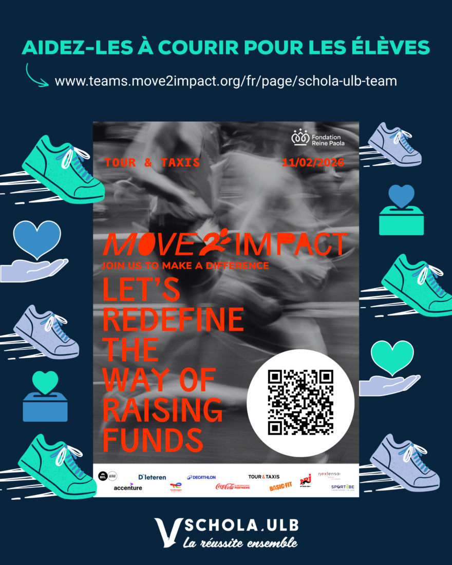 Cette année, Schola ULB est fière de faire partie des 64 associations bénéficiaires de l’événement. Grâce à MOVE2IMPACT, chaque pas parcouru devient un levier concret pour soutenir le Programme Tutorat, un projet bruxellois qui accompagne des élèves en difficulté scolaire et œuvre, depuis plus de 35 ans, pour l’égalité des chances à l’école.